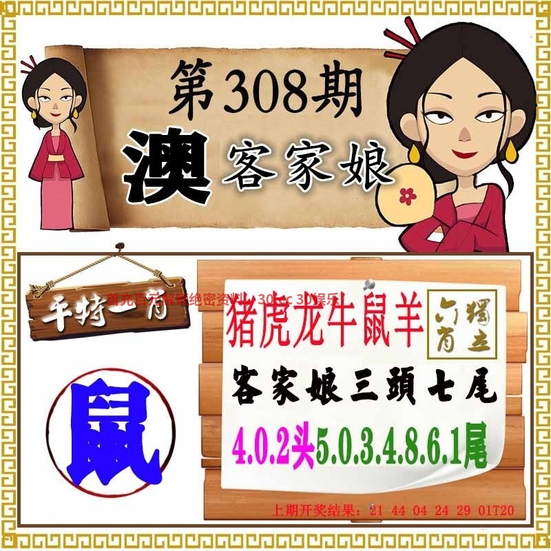 | 307期:九肖 | 鼠鸡牛虎蛇狗猴龙猪 | 开:狗20 |